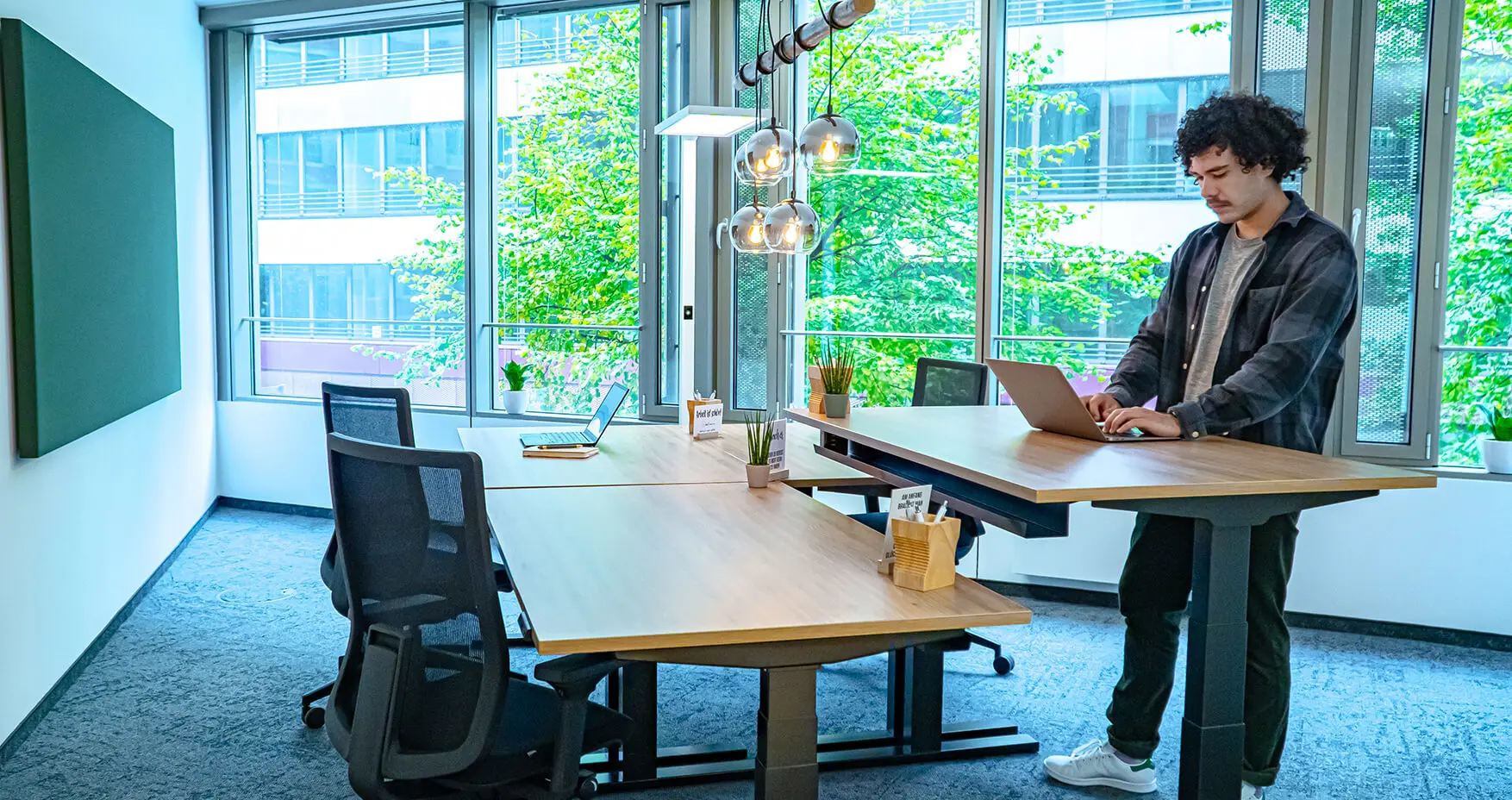 Größe: 1300qm, 2 Etagen, 30+ private Büros, 3 Meetingräume