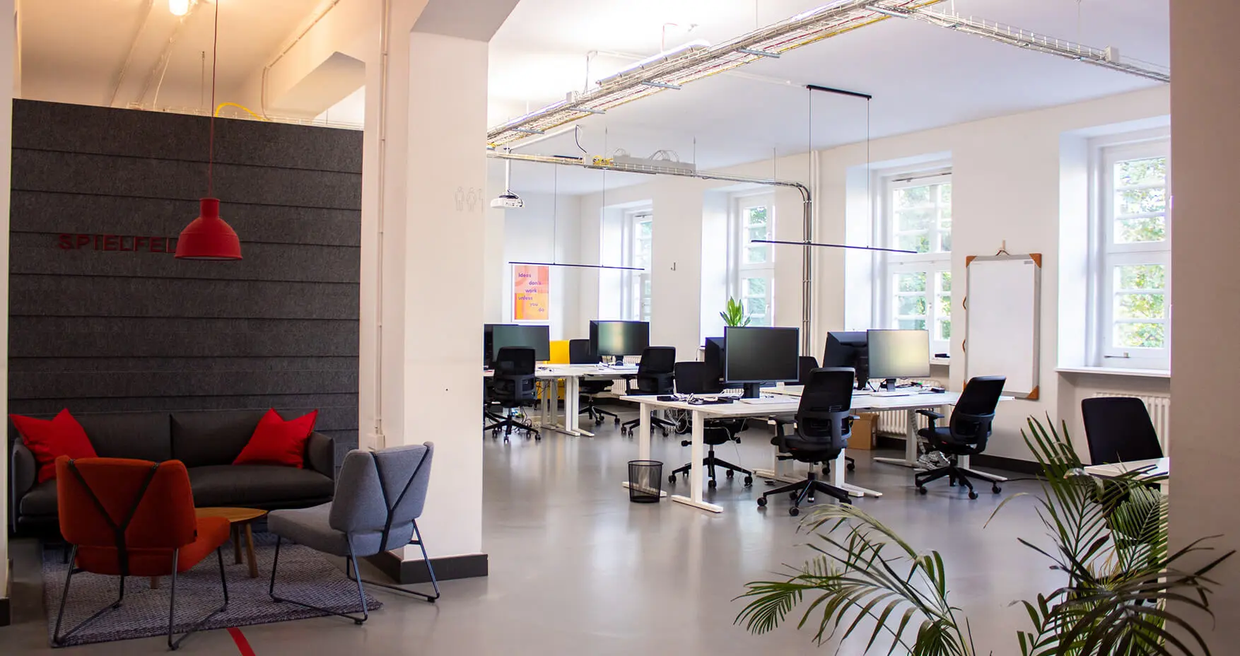 Das Coworking Space Spielfeld befindet sich mitten in Kreuzberg. An der Skalitzer Straße 85/86 gibt es sowohl Arbeitsplätze im Open Space als auch private Büros. Die Flächen sind sehr modern. Die Lage ist perfekt, das Hub kann mit Bus und Bahn aber auch dem Auto bequem erreicht werden. Die Nachbarschaft punktet zudem mit sehr viel Gastronomie. Dementsprechend findet man hier vorrangig Startups, aber auch einige größere Unternehmen.
