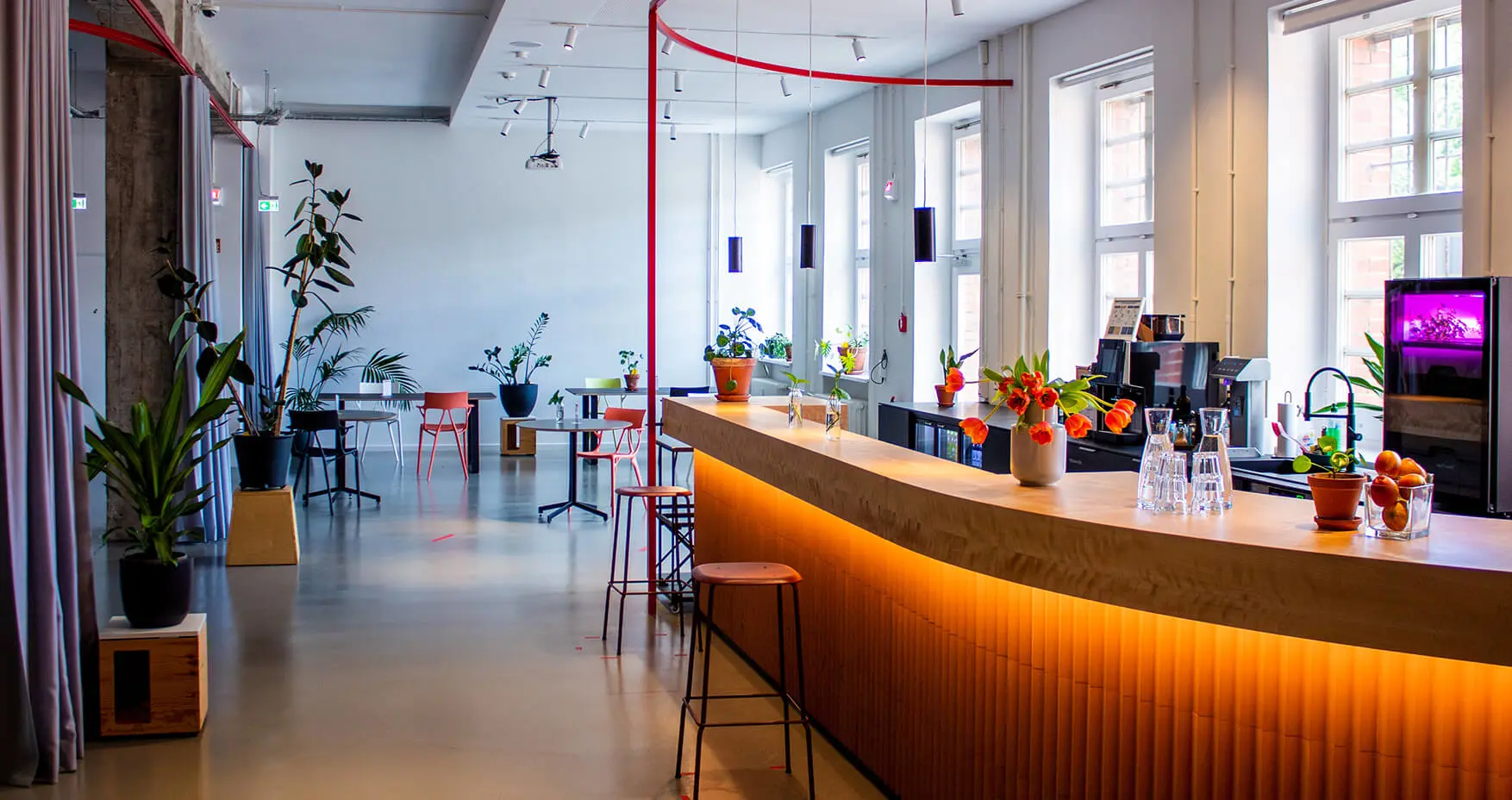 Größe: 3000qm, 3 Etagen, 12 private Büros, 150+ Arbeitsplätze